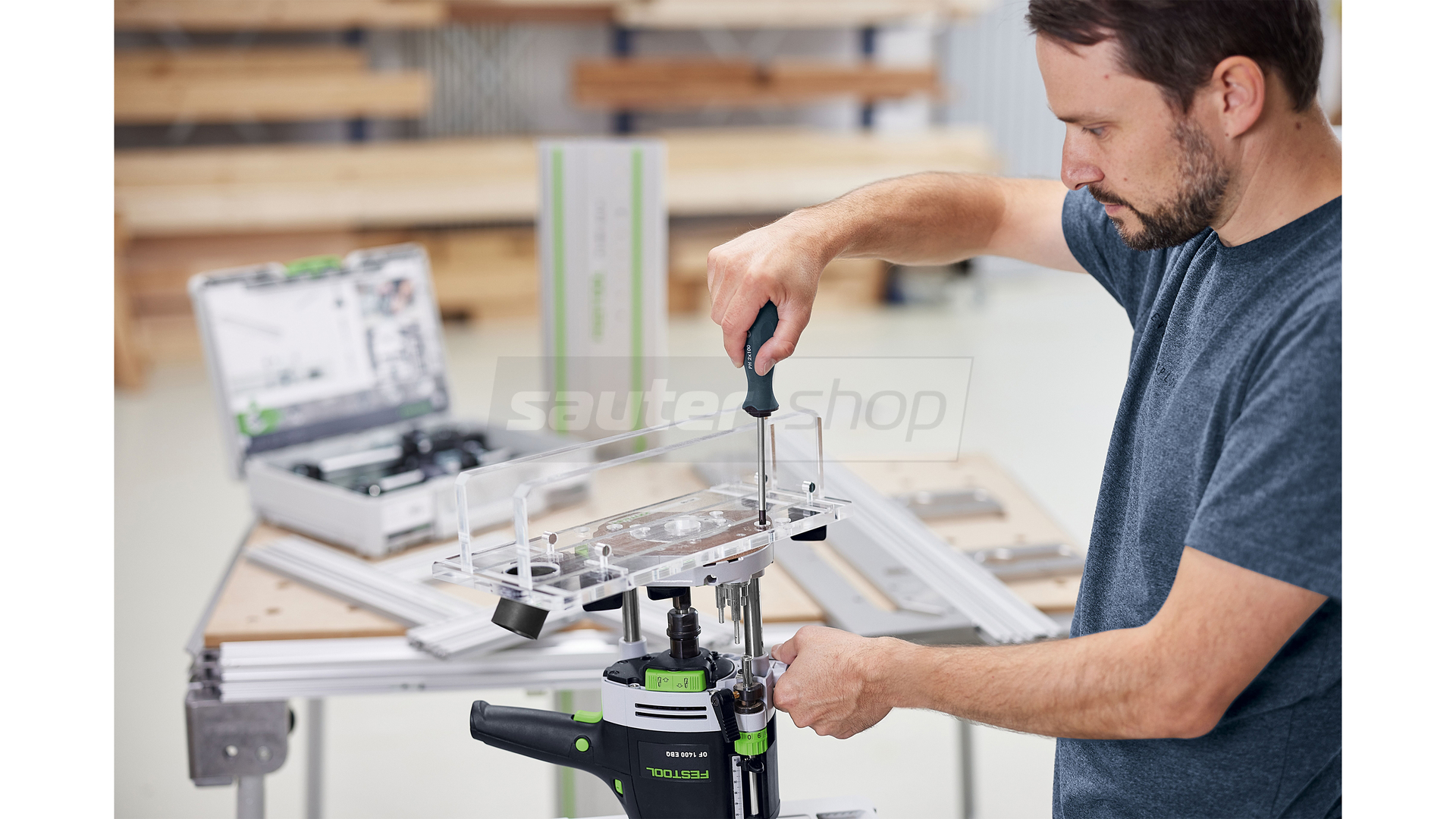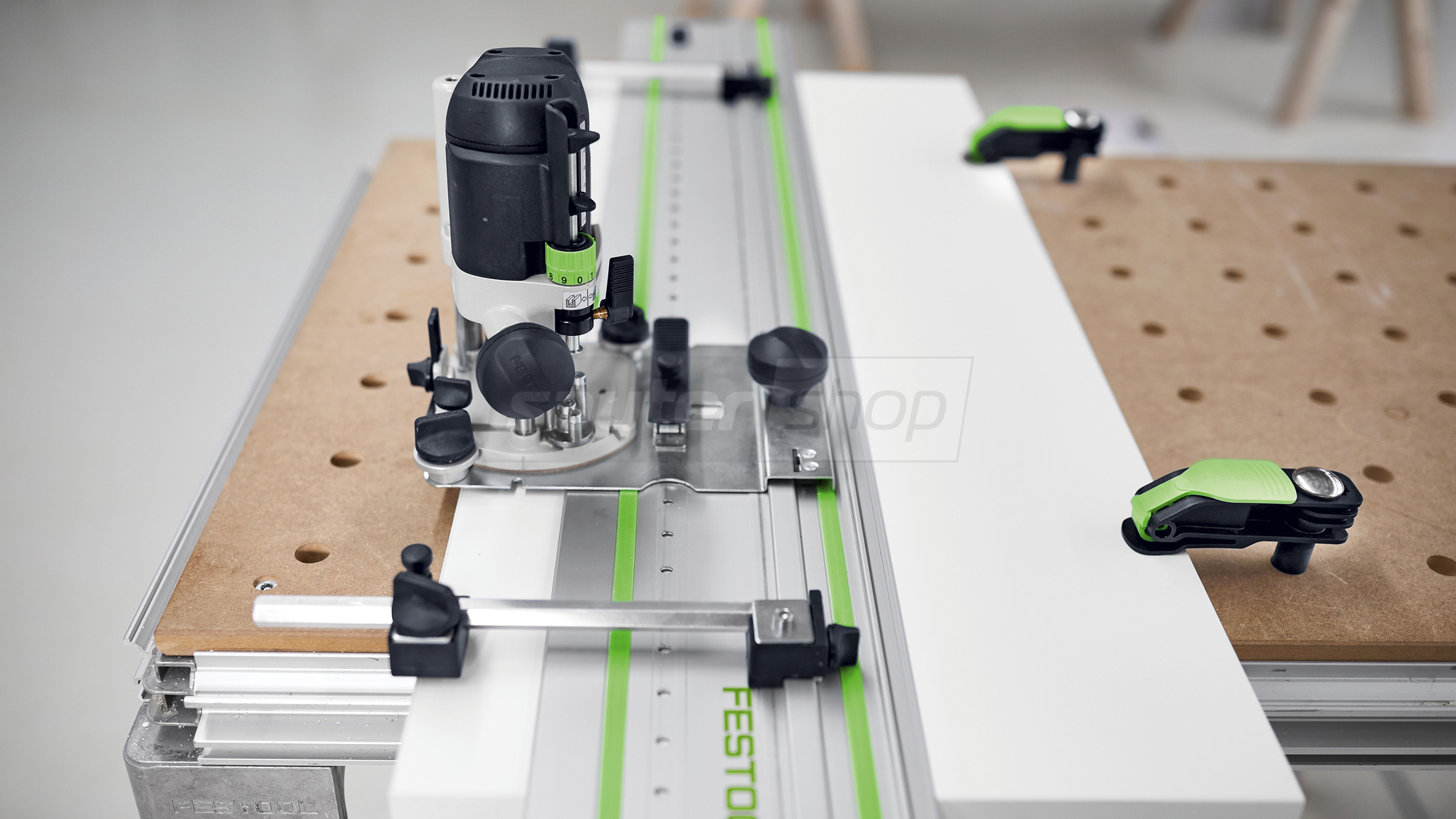 - Die korrekte Führung wird durch die Feineinstellung des Führungsspiels und einen zusätzlichen Handgriff an der Führungsplatte gewährleistet.