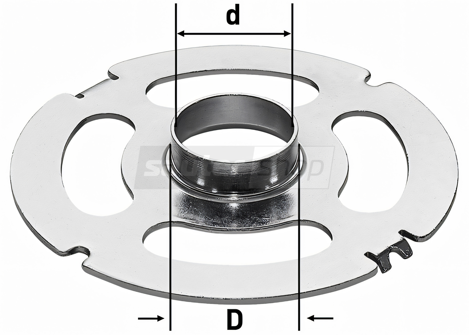 Kopierring zur sicheren Führung der Oberfräse beim Fräsen mit einer Schablone. Hierbei spielt es keine Rolle, welche Form die Schablone hat.