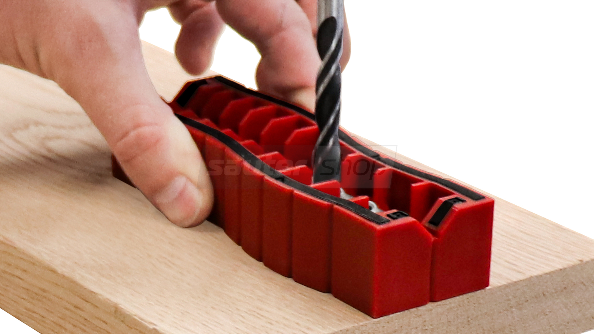 - DrillBlock auf das Werkstück legen und Bohrer stets senkrecht ansetzen.