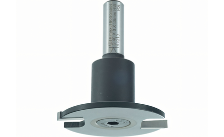 Ein Scheibennutfräser, der direkt auf den Aufnahmeschaft montiert und auswechselbar ist. Der Durchmesser des zweischneidigen Fräsers beträgt 40 mm und ermöglicht eine maximale Frästiefe von 12 mm. Die versenkte Befestigungsschraube ermöglicht das Nuten auch auf flachen Oberflächen.