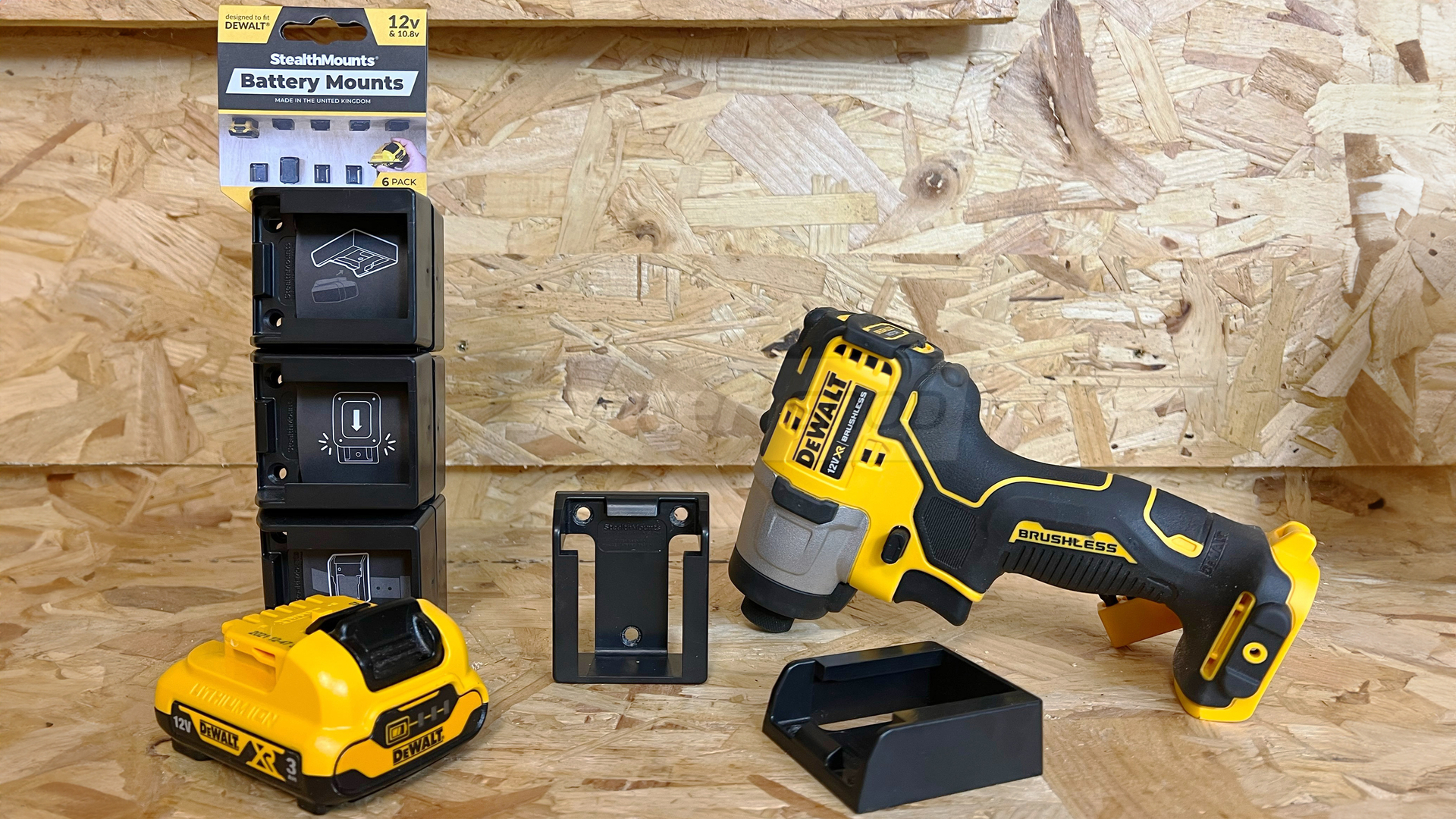 Schwarze StealthMounts Akkuhalterungen für DeWalt 12V, 6 St.
