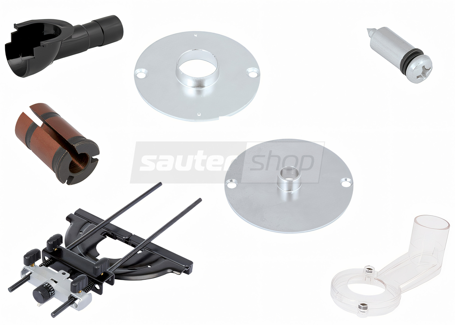 1x Oberfräse T7, 1x Parallelanschlag mit Micro-Feineinstellung, 1x Absaugstutzen, 1x Spannzange 12 mm, 1x Reduzierhülse Ø 8 mm, 1x Kopierring 16 mm 1x Kopierring 30 mm, 1x Maulschlüssel, 1x Koffer